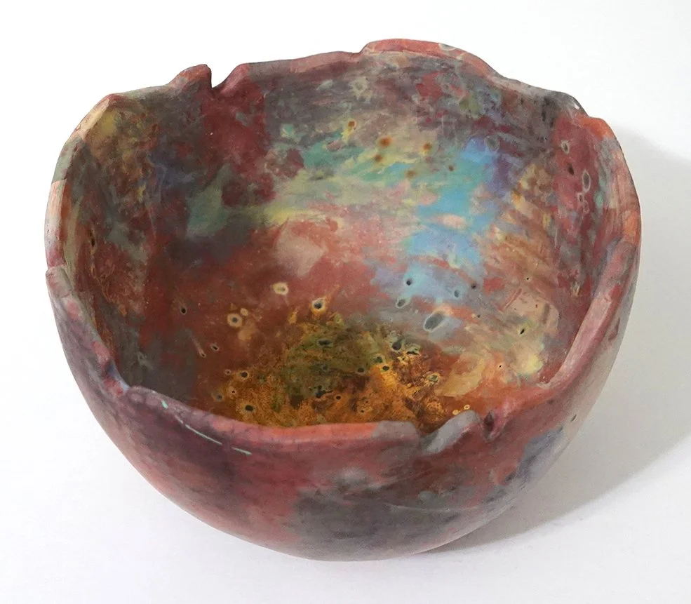 Finally, my favorite piece (mostly due to the finish, but I also like the shape). However, it unfortunately blew off an outer side piece of exterior as well as a piece off the bottom in the stressful firing and cooling process. Since it’s raku anyway (meaning it’s not food-safe or watertight even when undamaged), it’s less important when a piece is damaged. Luckily neither of these blown-off spots went all the way through the ceramic body or caused cracks to the body itself, so they’re just cosmetic and the ceramic itself is still sturdy. I decided to try a kintsugi-inspired repair for the side wall, and just put a foam furniture foot in the bottom cavity for added stability.