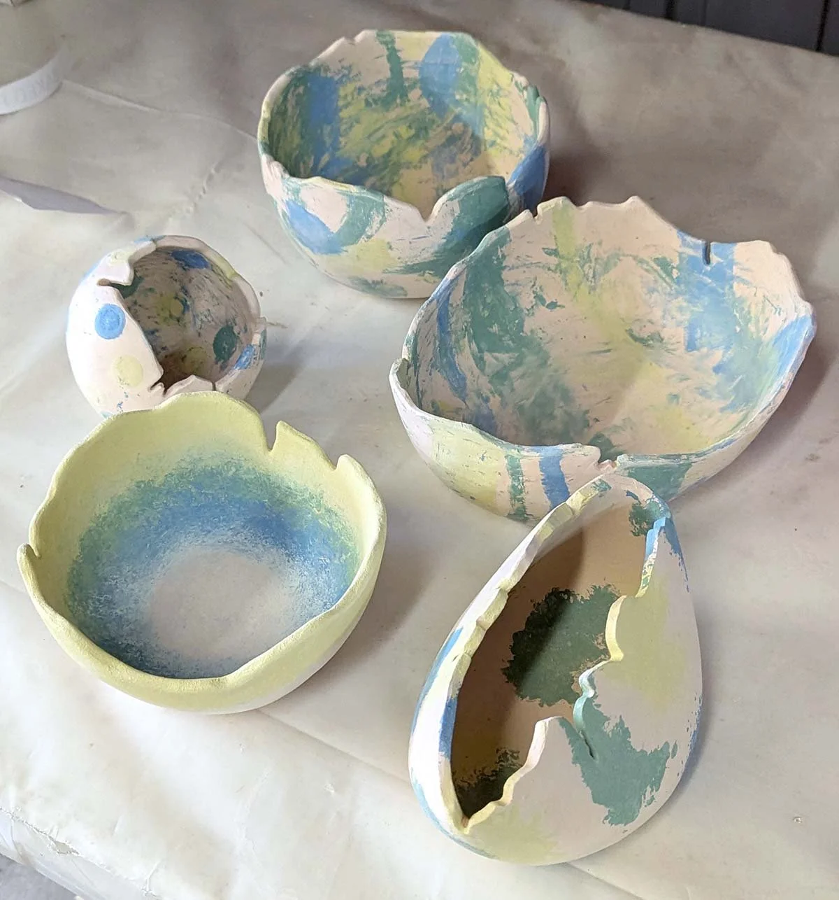 Here are the Mason stained, ferric chloride dipped, and saggar fired pottery resulting from my fall workshop! I used three different Mason stains: chartreuse, jade green, and dark teal. I mixed the stains with terra sigillata and applied them in a variety of ways (brush, sponge, scraper). I was purposely going for choppier, sectioned out applications of the Mason stain this workshop to compliment the choppy, random ferric chloride saggar markmaking. (I previously experimented with all-over solid dark teal in varying terra sigillata tints.) To the right is an image of all the bisqued pieces for awaiting ferric chloride dipping for this workshop.