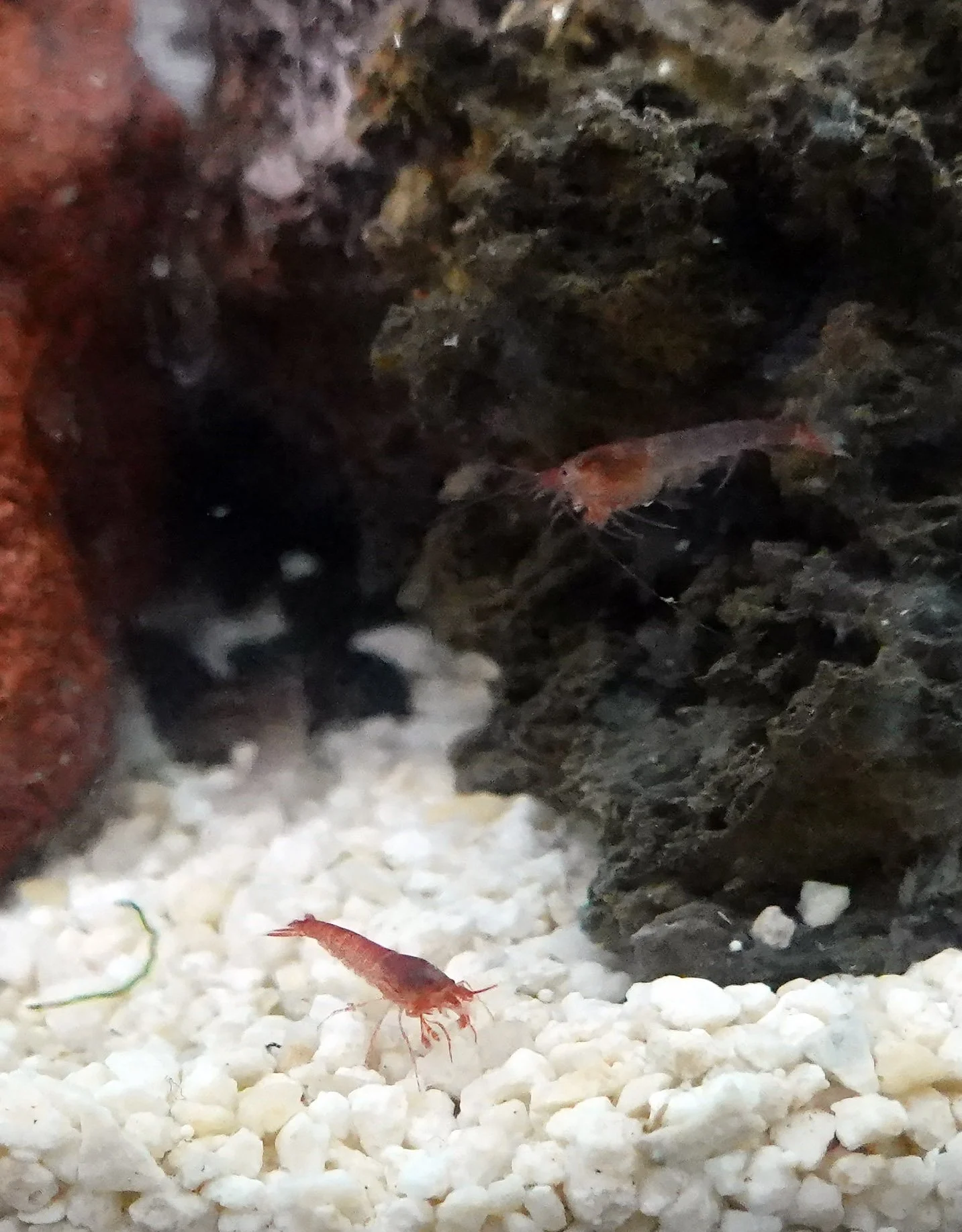 An opae ula shrimp swimming next to a Malaysian trumpet snail in my new tank.